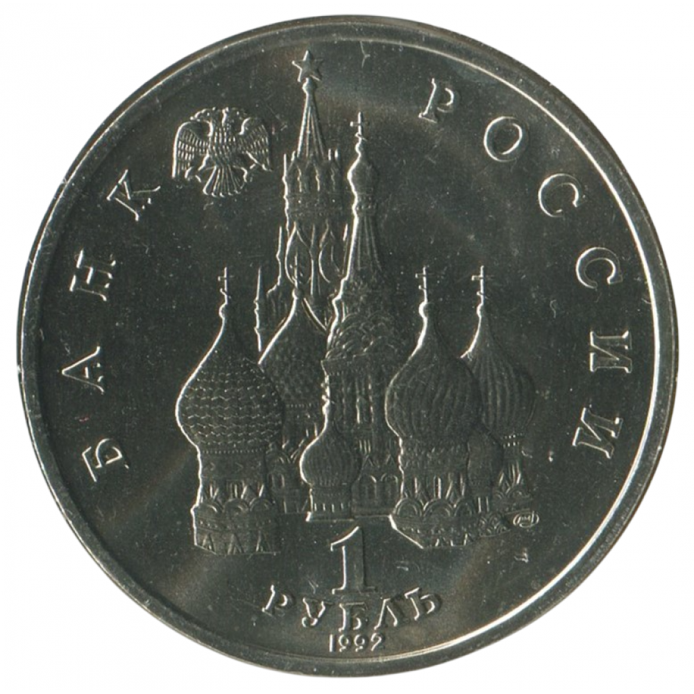 Аверс: сверху влево небольшое изображение двухглавого орла, слева слово «БАНК», справа «РОССИИ», внизу обозначение достоинства монеты - цифра «1» под ним слово «рубль», ниже год выпуска монеты «1992», в середине Собор Покрова Пресвятой Богородицы (собор Василия Блаженного) и за ним Спасская башня Московского Кремлля, чуть ниже и правее монограмма монетного двора «ЛМД».