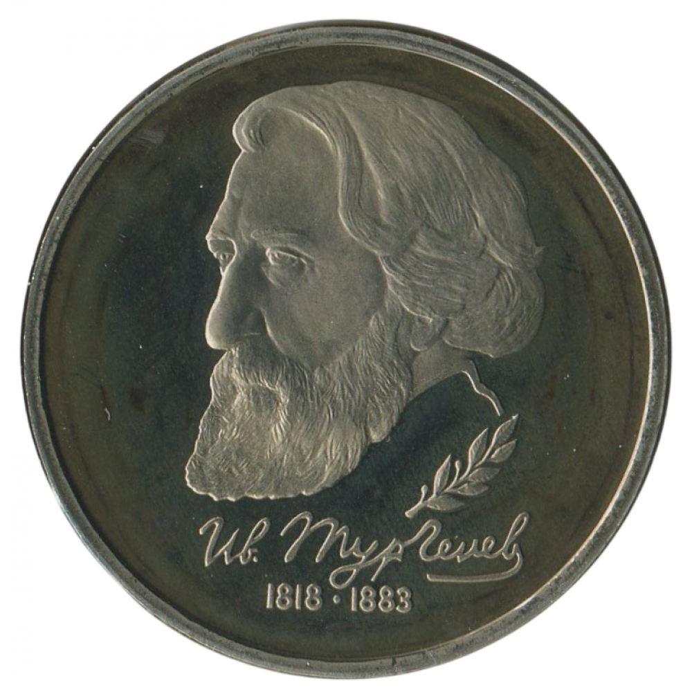 Реверс: портрет И.С.Тургенева, справа внизу - лавровая ветвь, внизу - факсимиле писателя и даты: "1818 - 1883".