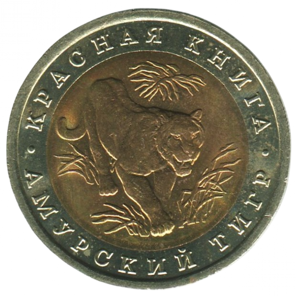 Реверс: рельефное изображение амурского тигра, по окружности - надписи, разделённые двумя точками: вверху - "КРАСНАЯ КНИГА", внизу - "АМУРСКИЙ ТИГР".