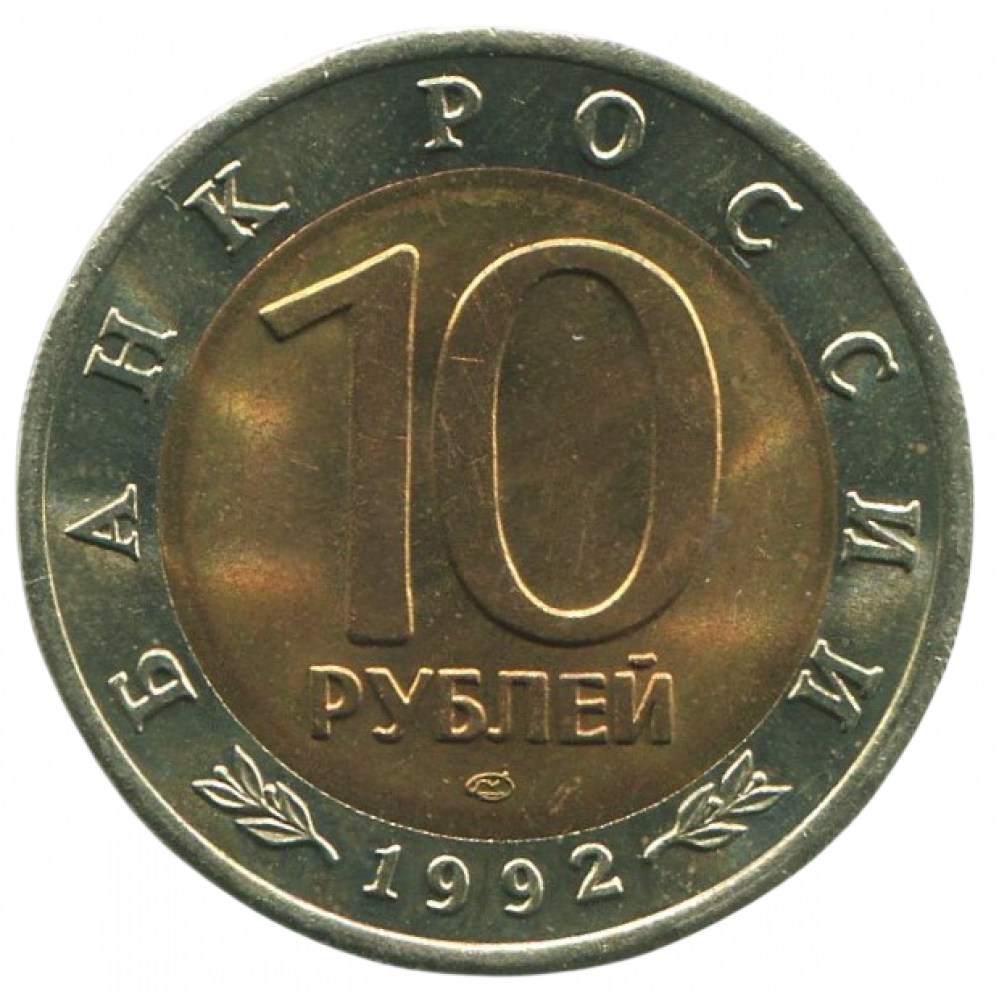 Аверс: в центре диска - надпись в две строки "10 РУБЛЕЙ", под ней - товарный знак монетного двора, по окружности - надписи, разделённые орнаментом: вверху - "БАНК РОССИИ", внизу - "1992".