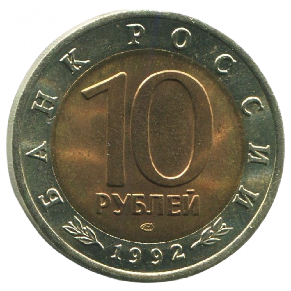 Аверс: в центре диска - надпись в две строки "10 РУБЛЕЙ", под ней - товарный знак монетного двора, по окружности - надписи, разделённые орнаментом: вверху - "БАНК РОССИИ", внизу - "1992".