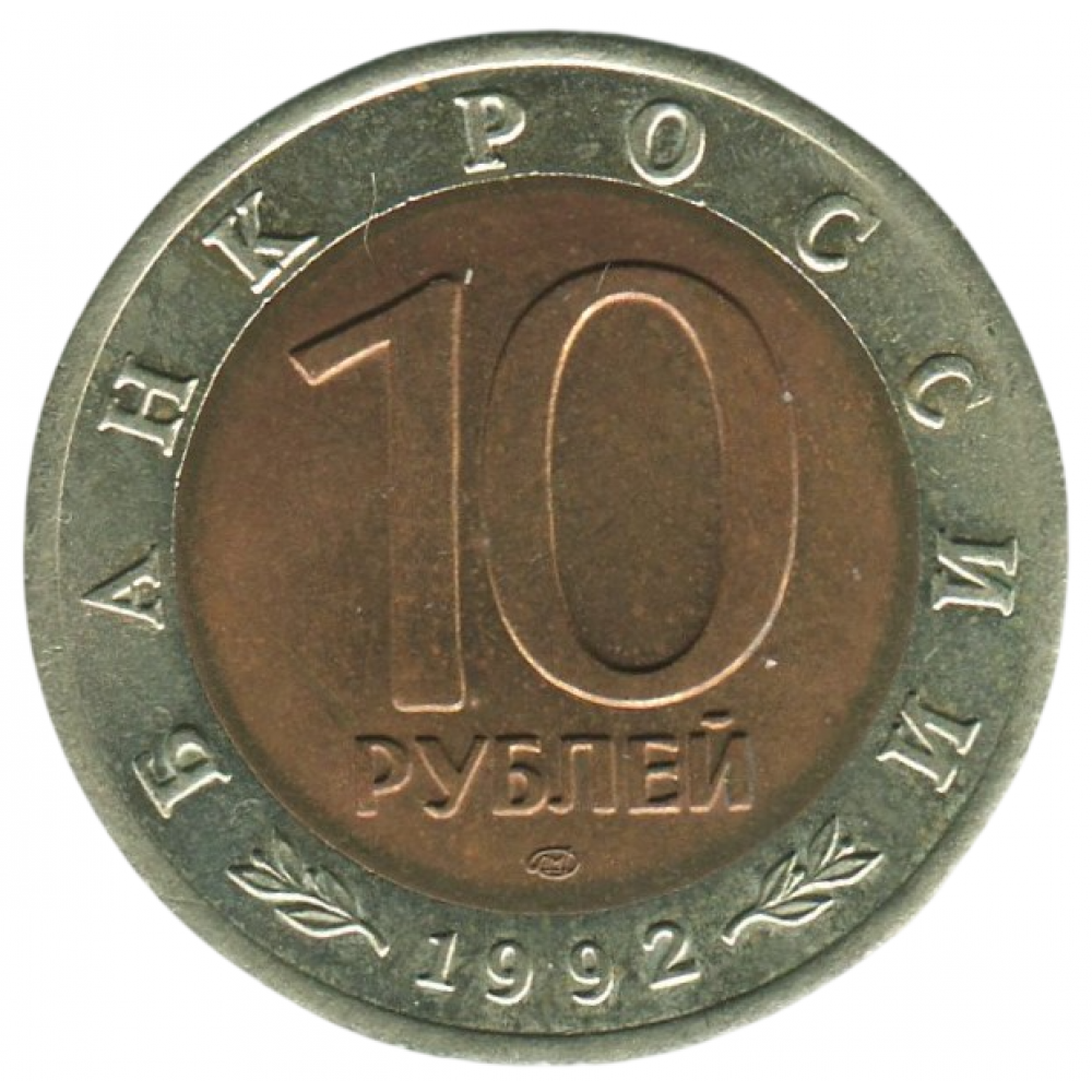 Аверс: в центре диска - надпись в две строки "10 РУБЛЕЙ", под ней - товарный знак монетного двора, по окружности - надписи, разделённые орнаментом: вверху - "БАНК РОССИИ", внизу - "1992".