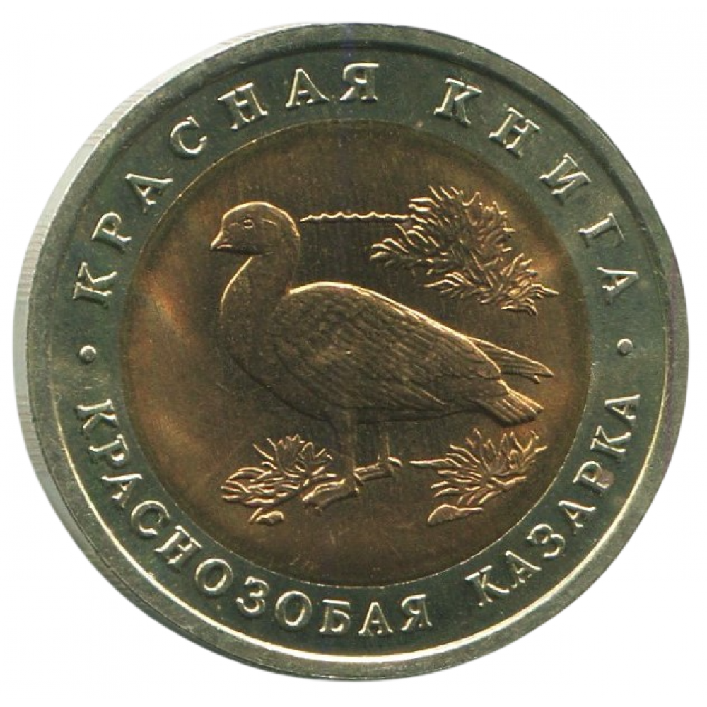 Реверс: рельефное изображение краснозобой казарки, по окружности - надписи, разделённые двумя точками: вверху - "КРАСНАЯ КНИГА", внизу - "КРАСНОЗОБАЯ КАЗАРКА".