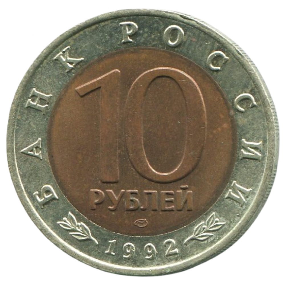 Аверс: в центре диска - надпись в две строки "10 РУБЛЕЙ", под ней - товарный знак монетного двора, по окружности - надписи, разделённые орнаментом: вверху - "БАНК РОССИИ", внизу - "1992".