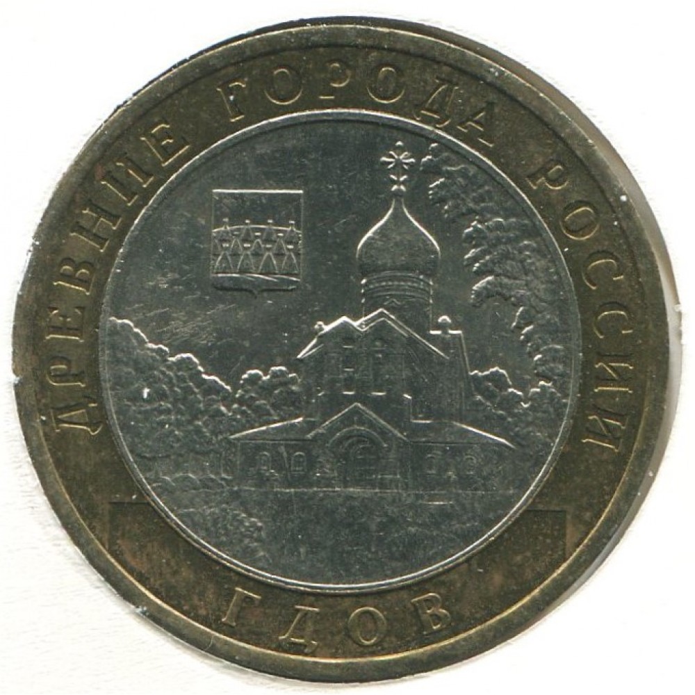 Монета 10 рублей Гдов из серии «Древние города России», была отчеканена Московским монетным двором в 2007 году. Отлили ее в количестве 5000000 экземпляров по заказу Банка России, при помощи сплавов нескольких различных материалов: латуни и мельхиора. Ее диаметр составляет 27 мм, а вес составляет почти 9 грам.