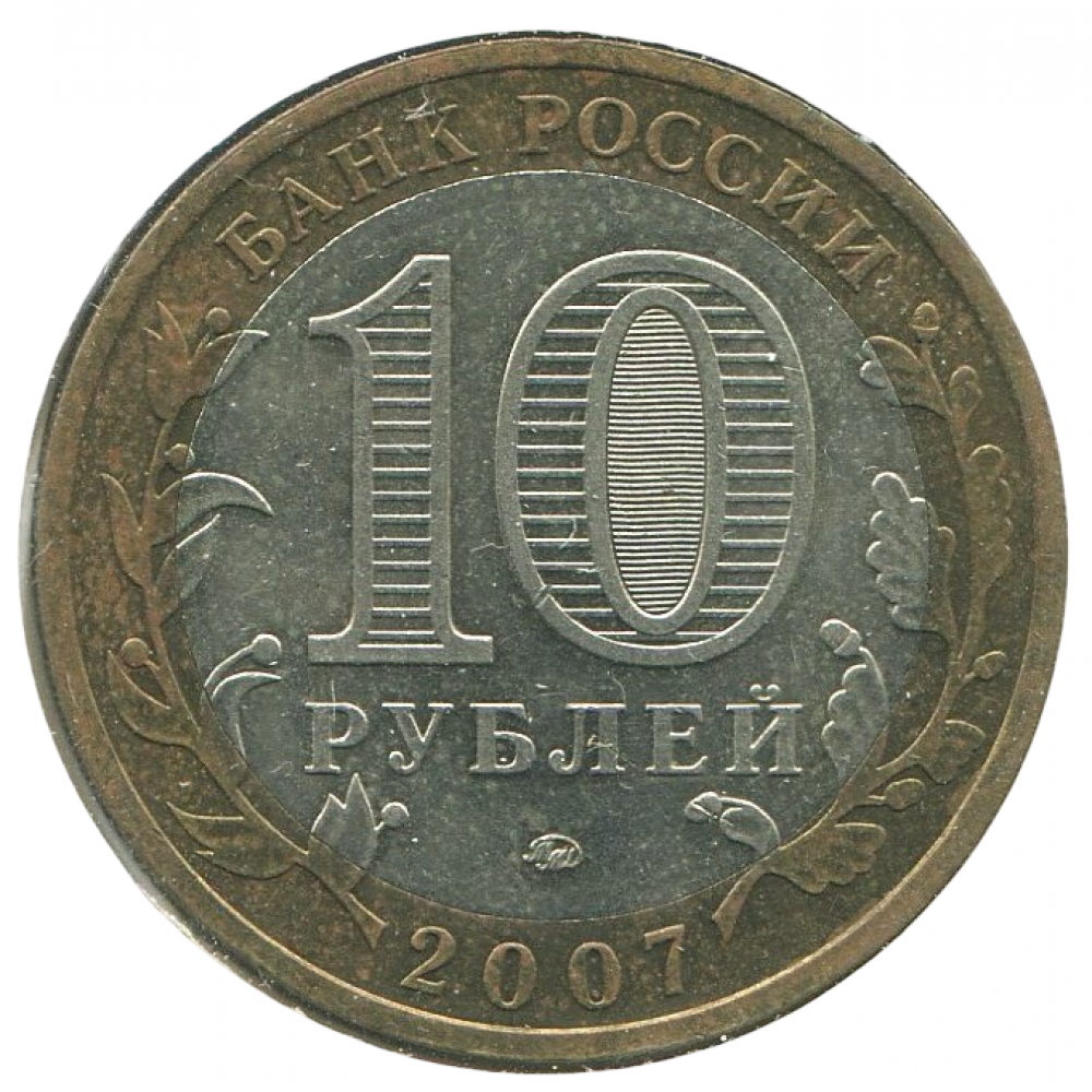 Аверс: мельхиоровый круг украшает цифра «10». Веточки дуба и лавра окаймляют ее, заходя частично на латунный ободок. В центре нуля под разными углами можно рассмотреть горизонтальную цифру «10» и надпись «руб». Внизу, на латунной части закругляется год выпуска, над которым виднеется значок монетного двора (на белом фоне). Сверху располагается надпись «Банк России».