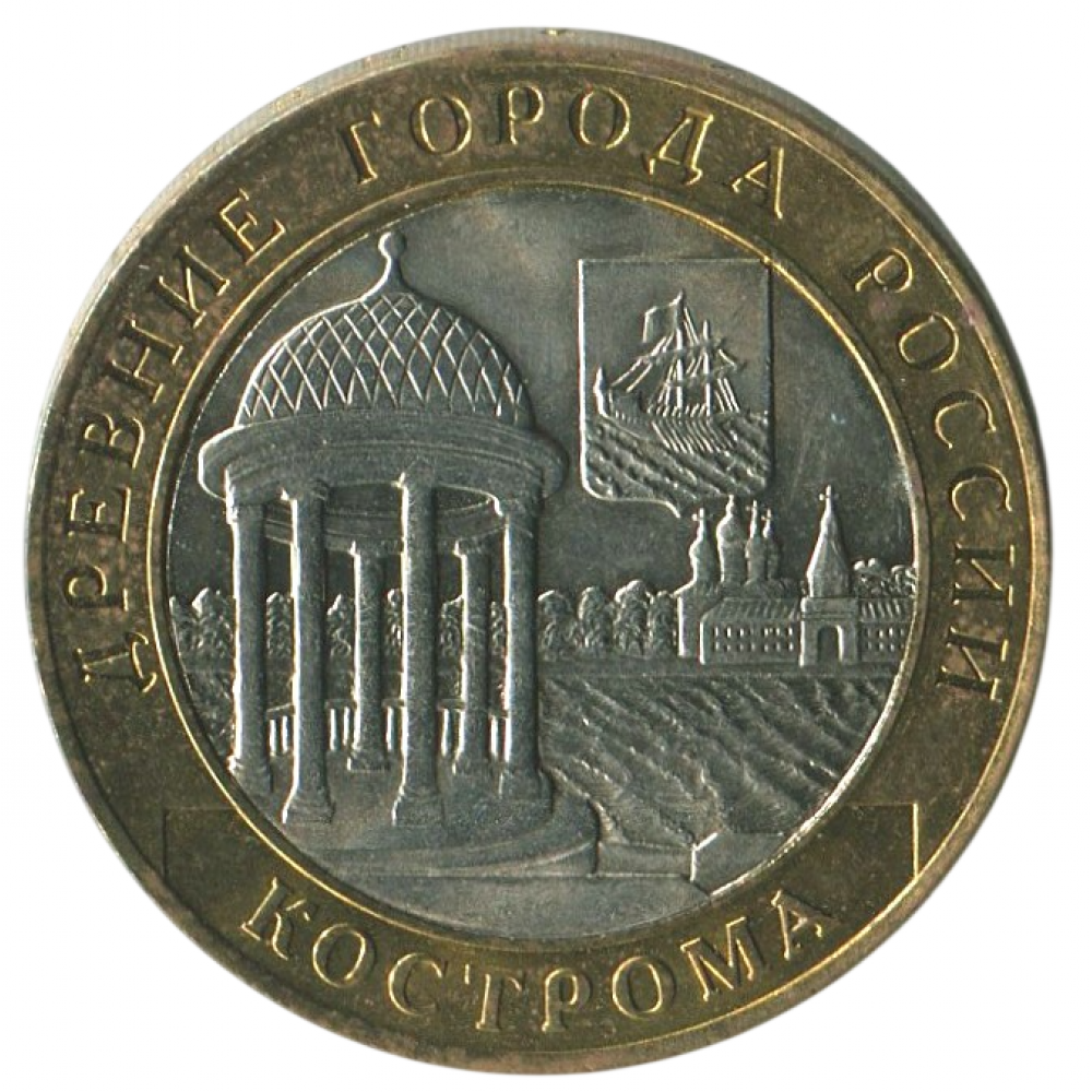 Одна из монет серии «Древние Города России» 10 рублей Кострома выпущена 27.06.2002. Эта серия памятных монет ЦБРФ выпускалась с 2002 по 2012 год, возобновлена с 2014 и продолжается по настоящее время. Кострома представлена в таком выпуске монет неслучайно. В 1152 году ее основал Юрий Долгорукий, в 1246 году Кострома стала столичным городом, а через 118 лет входит в состав владений Московских. С этих пор и начинается активное участие костромчан в жизни России. В настоящее время Кострома входит в «Золотое кольцо России». На монете 10 рублей Кострома 2002 присутствует сразу несколько достопримечательностей: беседка Островского, Ипатьевский монастырь, герб города и река Волга.