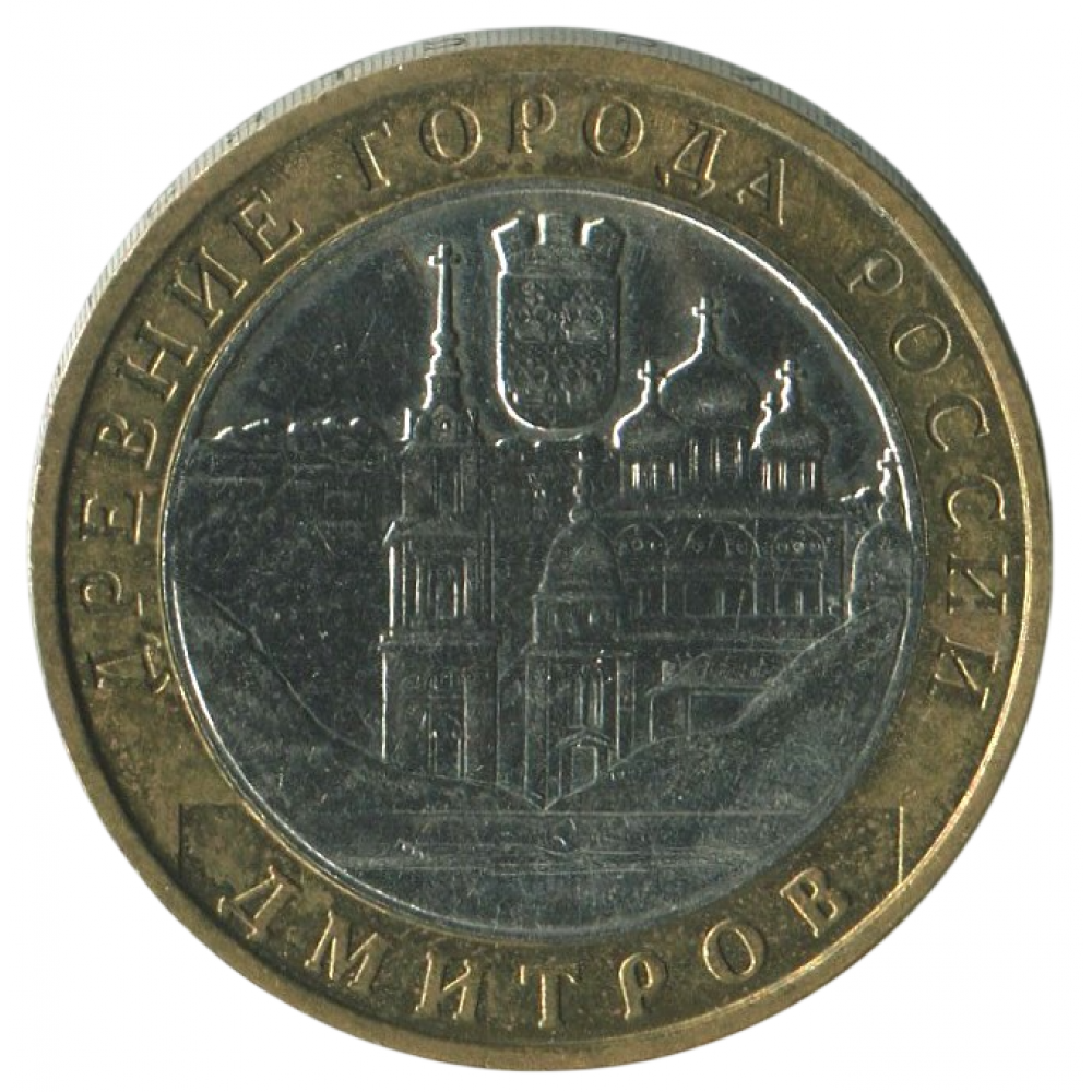 Среди монет, выпущенных Банком России в серии «Древние города России», монета Дмитров занимает свою определенную нишу достоинством 10 рублей. Эта монета выполнена из биметалла, что придает ей оригинальности и делает желанным экземпляром в коллекции любого нумизмата. Она является монетой юбилейной, увековечивающей в памяти потомков славный город.