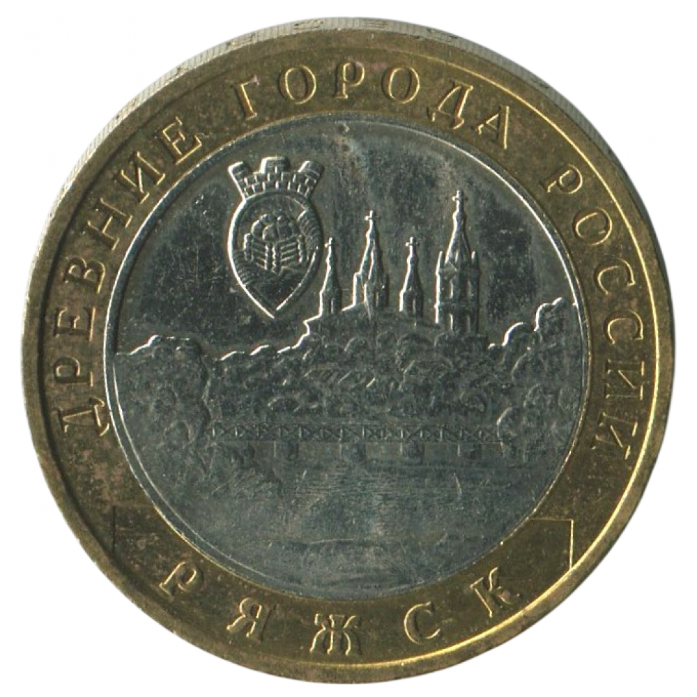 Монета Ряжск чеканится из сплавов латунь и мельхиор и относится к разряду памятных монет. Она была выпущена Банком России и отчеканена на ММД. На аверсе ее располагаются: