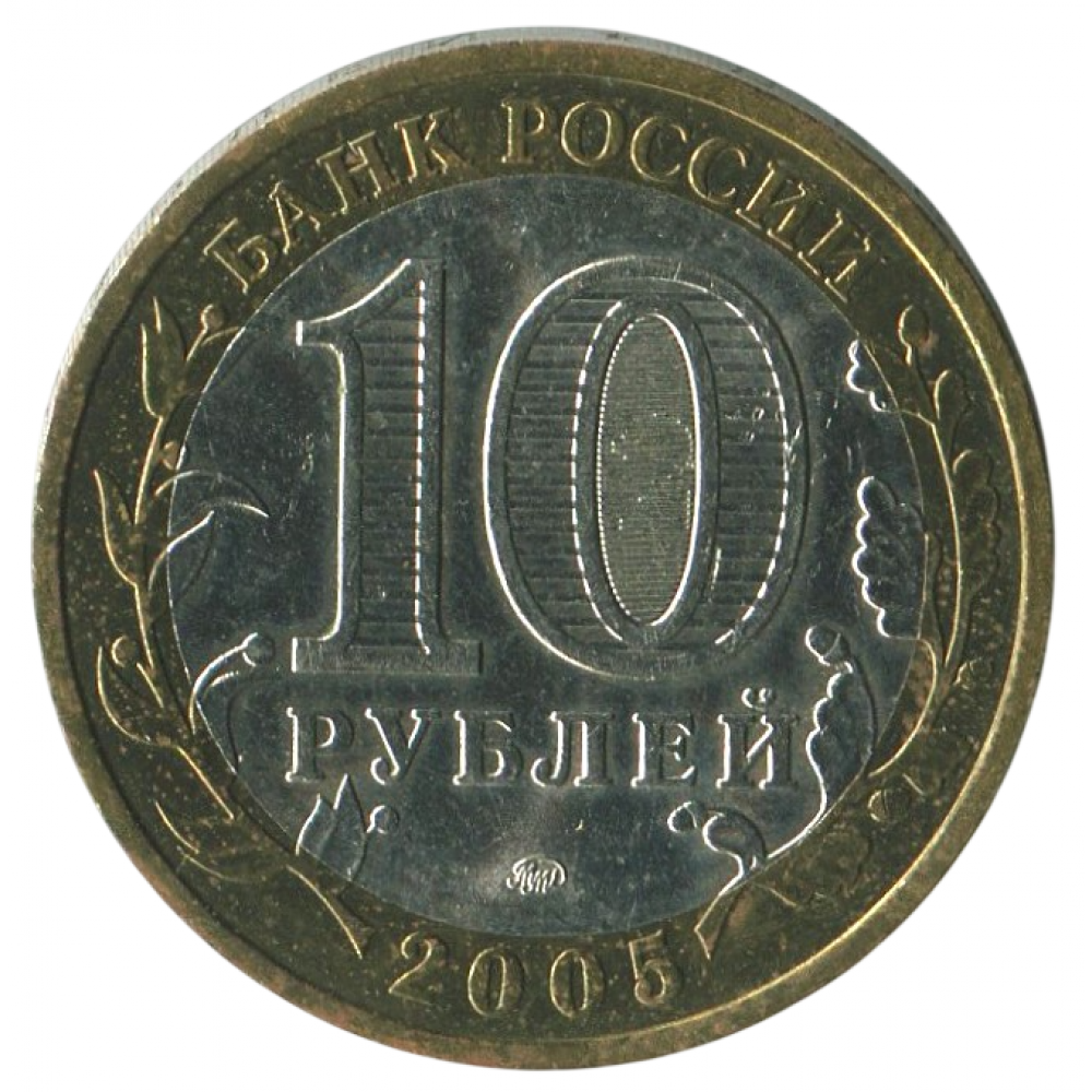 в центре диска – обозначение достоинства монеты «10 РУБЛЕЙ». Внутри цифры «0» – скрытые, видимые поочередно при изменении угла зрения изображения цифры «10» и надписи «РУБ». В нижней части диска – товарный знак монетного двора. В верхней части кольца по окружности – надпись: «БАНК РОССИИ», в нижней – дата «2005», слева и справа – стилизованные ветви растений, переходящие на диск.