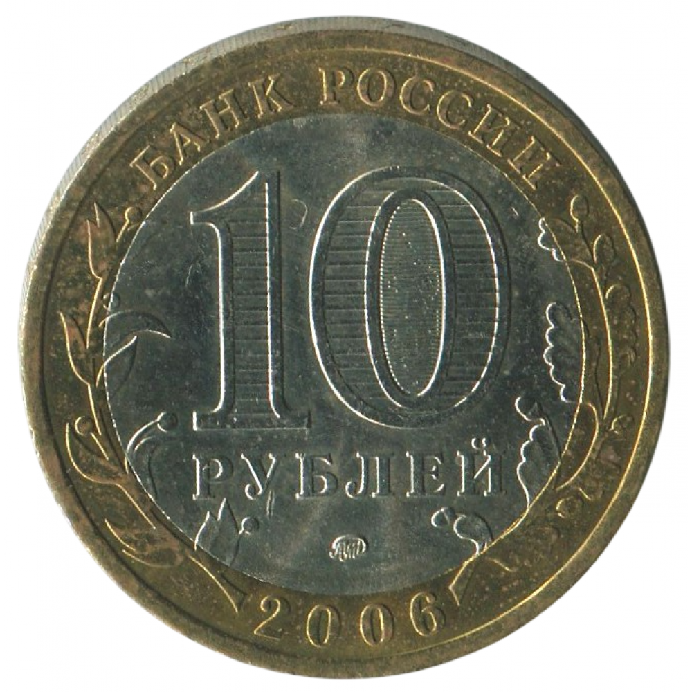 На аверсе в центре обозначен номинал монеты: 10 рублей. У этой десятки внутри цифры «ноль» есть скрытые надписи «10» и «РУБ» (их можно рассмотреть по очереди, если менять угол зрения). Внизу на мельхиоровом диске монеты расположен товарный знак Московского монетного двора, ниже по кольцу проставлен год выпуска – 2006; по обеим сторонам - ветви растений, которые вьются по окружности, вытягиваясь вверх к надписи «БАНК РОССИИ».