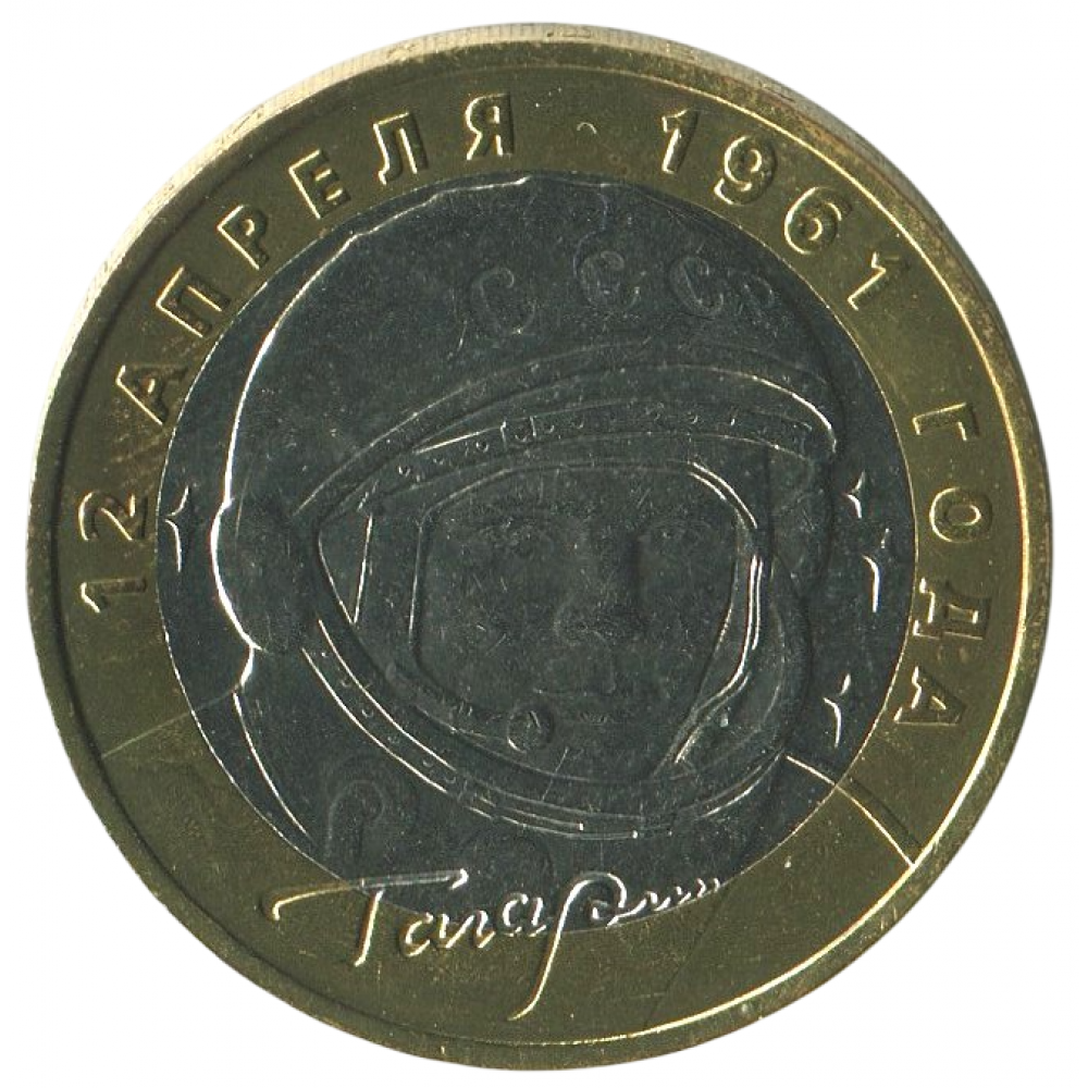 Реверс: изображение Ю.А. Гагарина в скафандре, под ним — подпись-факсимиле «ГАГАРИН», вверху по окружности — надпись: «12 АПРЕЛЯ 1961 ГОДА».