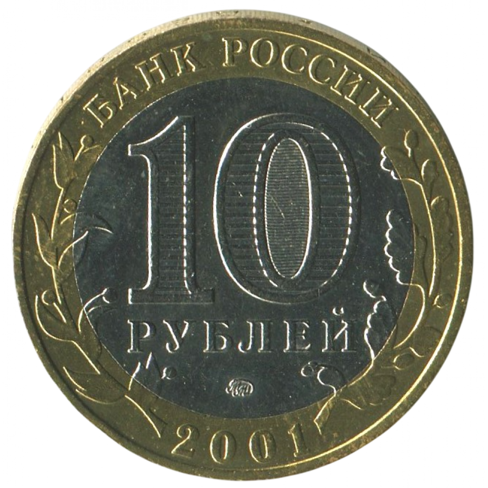 Аверс: сверху вдоль края монеты слова «БАНК РОССИИ», внизу год выпуска «2001», слева лавровая ветвь, справа дубовая, обе ветви частично заходят на центральную вставку. В середине номинал монеты «10 РУБЛЕЙ», внутри цифры «0» попеременно видимые при наклоне монеты надписи «10» и «РУБЛЕЙ».