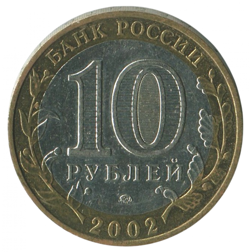 Аверс: на мельхиоровом диске в центре номинал монеты «10 РУБЛЕЙ», в цифре «0» отображены видимые только при изменении угла зрения надписи «10» и «РУБ», внизу диска обозначение монетного двора «ММД». На латунном кольце сверху надпись «БАНК РОССИИ», снизу на нем стоит дата «2002», по правому и левому краям гирлянды из переплетенных листьев, переходящих с диска на ободок.