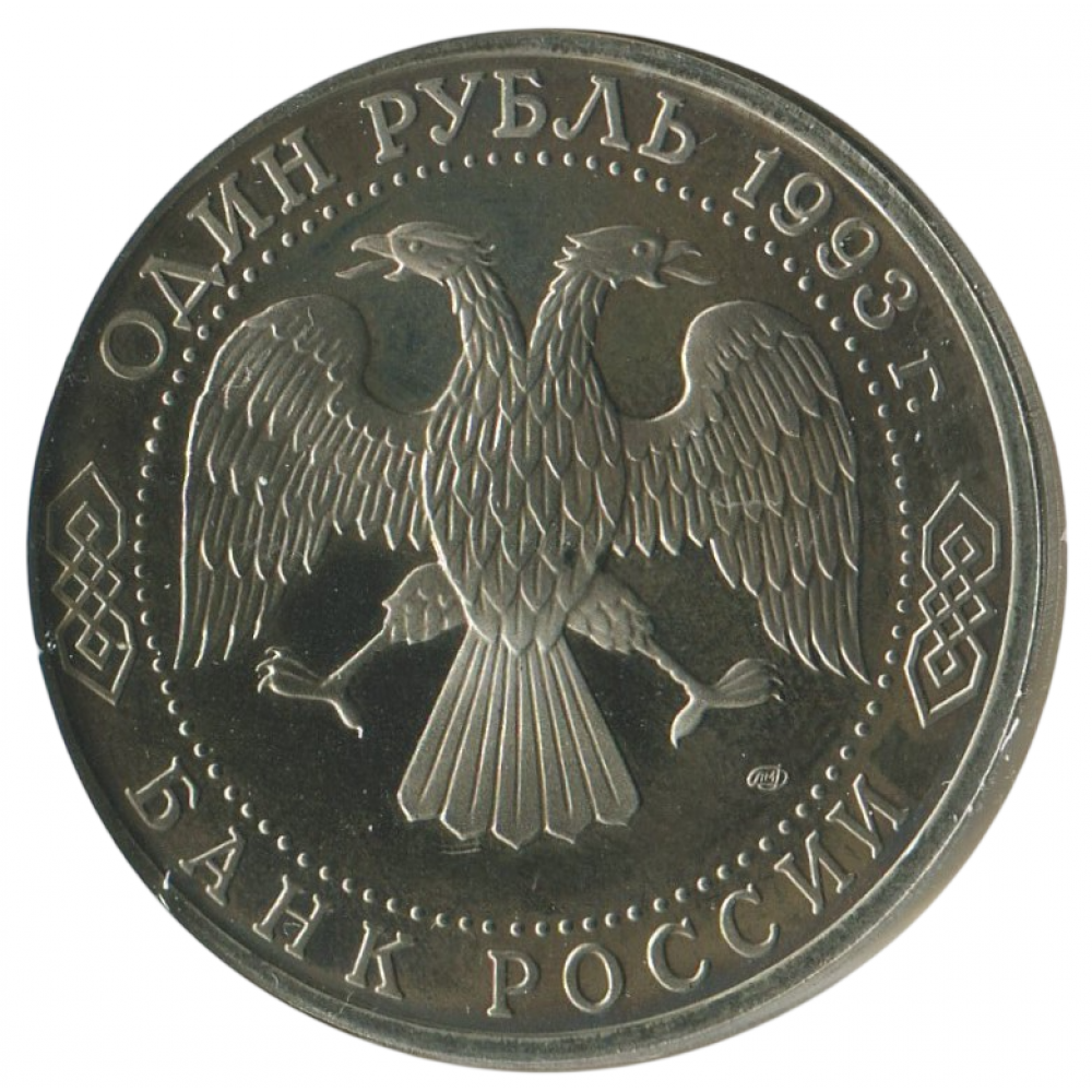 Аверс: вверху вдоль канта номинал «ОДИН РУБЛЬ» и год выпуска «1993 г.», внизу слова «БАНК РОССИИ». В середине двуглавый орел под ним справа монограмма монетного двора «ЛМД».