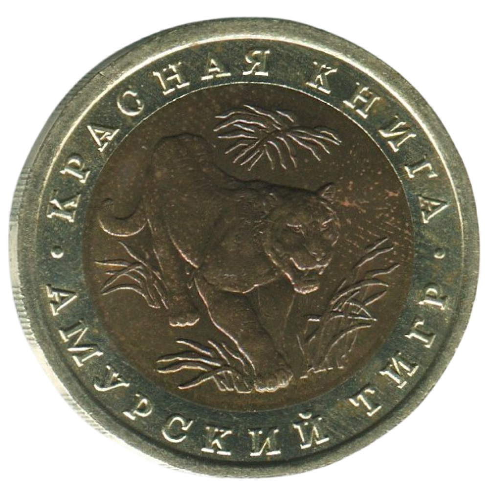 Реверс: рельефное изображение амурского тигра, по окружности - надписи, разделённые двумя точками: вверху - "КРАСНАЯ КНИГА", внизу - "АМУРСКИЙ ТИГР".