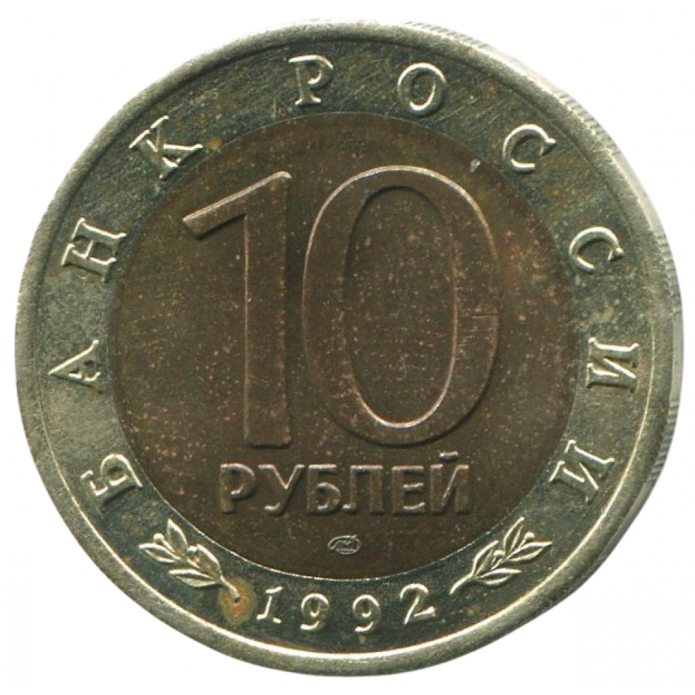 Аверс: в центре диска - надпись в две строки "10 РУБЛЕЙ", под ней - товарный знак монетного двора, по окружности - надписи, разделённые орнаментом: вверху - "БАНК РОССИИ", внизу - "1992".