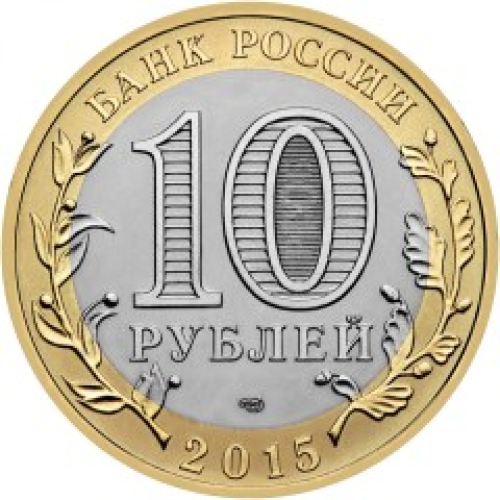 Аверс: в центре диска – обозначение номинала монеты: "10 РУБЛЕЙ", внутри цифры "0" – скрытые, видимые поочередно при изменении угла зрения изображения числа "10" и надписи "РУБ", в нижней части диска – товарный знак монетного двора, на кольце вдоль канта вверху – надпись: "БАНК РОССИИ", внизу – год выпуска: "2015", слева и справа – стилизованные ветви растений, переходящие на диск.