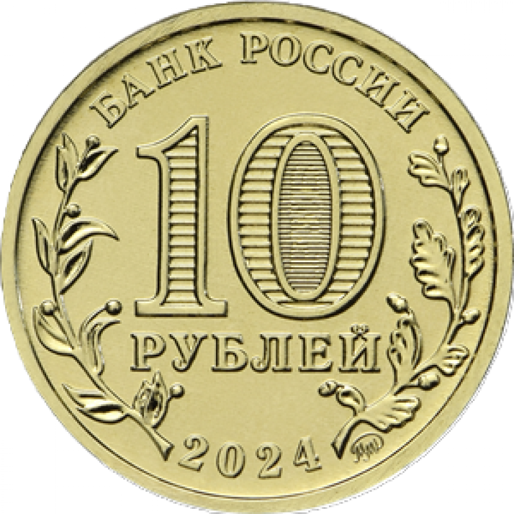 Аверс: обозначение номинала монеты «10 РУБЛЕЙ», внутри цифры «0» – скрытые, видимые поочередно при изменении угла зрения изображения числа «10» и надписи «РУБ», cлева и справа – стилизованные изображения ветви лавра и дуба соответственно, вдоль канта вверху – надпись «БАНК РОССИИ», внизу – год выпуска «2024», справа от него – товарный знак монетного двора.