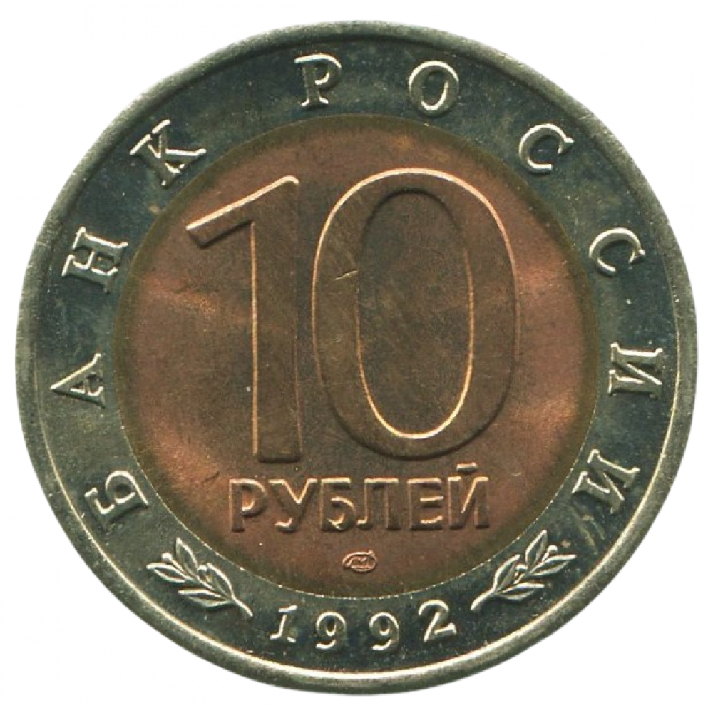 Аверс: в центре диска - надпись в две строки "10 РУБЛЕЙ", под ней - товарный знак монетного двора, по окружности - надписи, разделённые орнаментом: вверху - "БАНК РОССИИ", внизу - "1992".