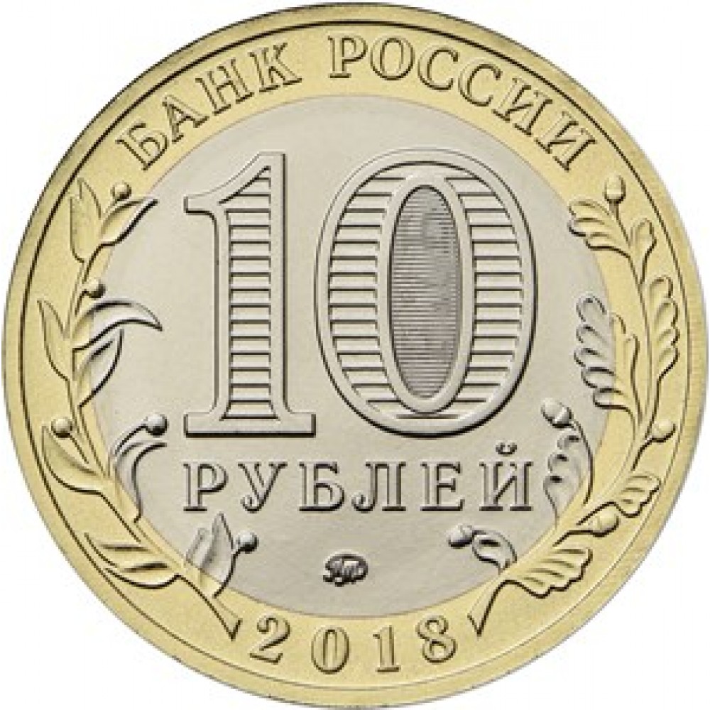 На лицевой стороне монет на кольце по окружности расположены надписи: в верхней части — «БАНК РОССИИ», в нижней части — «2018». Слева и справа на внешнем кольце расположены изображения ветви лавра и дуба, соответственно, элементы изображения которых переходят на диск. В центре диска расположены число «10» и надпись «РУБЛЕЙ» под ним, обозначающие номинал монеты. Внутри цифры «0» имеется защитный элемент в виде числа «10» и надписи «РУБ», наблюдаемых под разными углами зрения к плоскости монеты. В нижней части диска расположен товарный знак монетного двора.