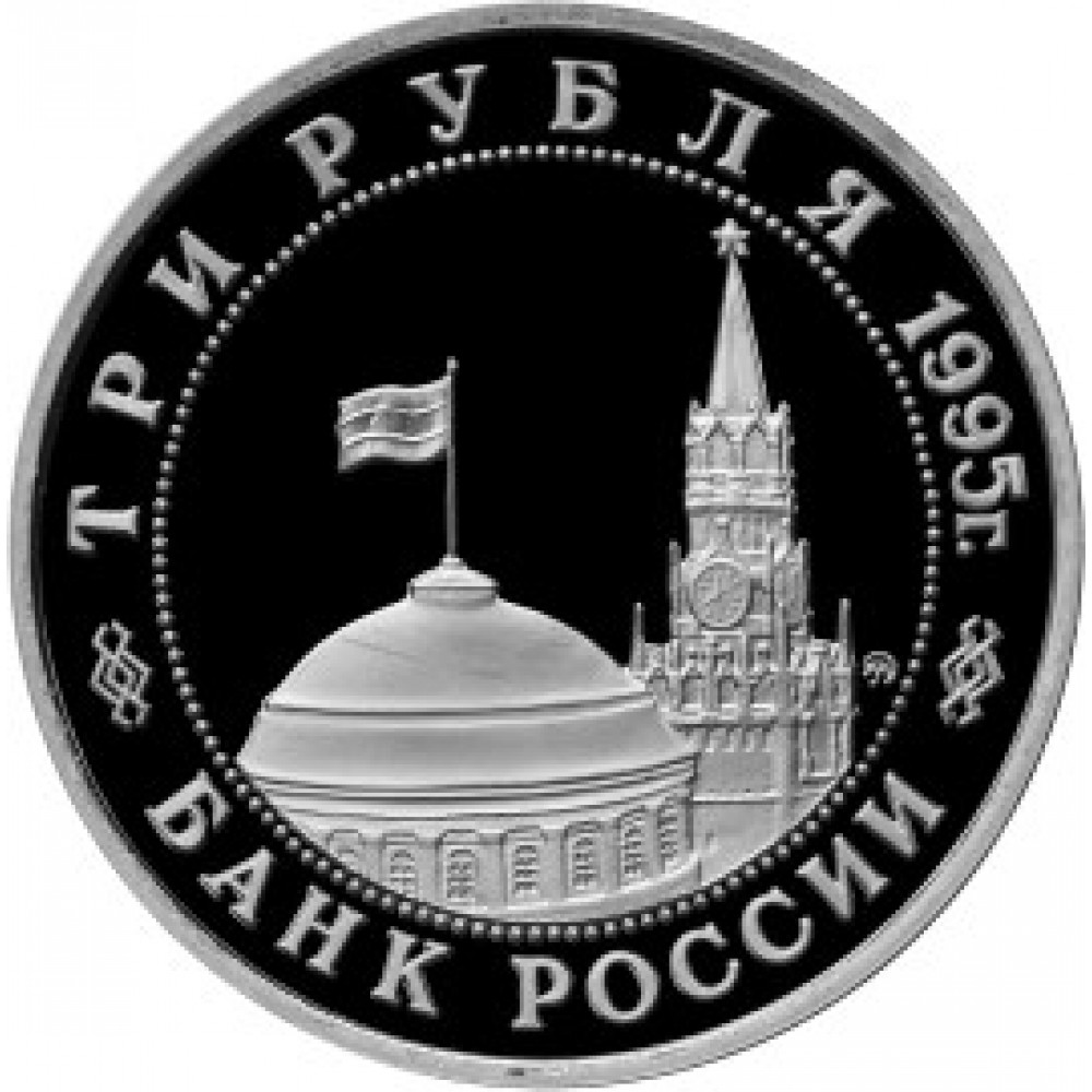 Аверс: вверху вдоль канта номинал «ТРИ РУБЛЯ» и год выпуска «1995 г.», внизу слова «БАНК РОССИИ». В середине в ободке из точек изображение Спасской башни Московского Кремля и частично перекрывающего ее купола Сенатского дворца с развевающимся флагом, с внутренней стороны точечного ободка справа монограмма монетного двора «ММД».