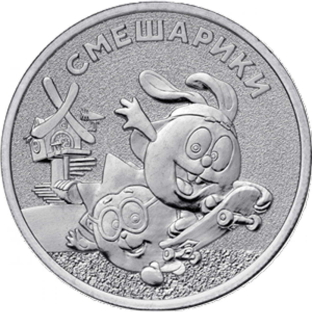 Аверс: рельефное изображение Государственного герба Российской Федерации, над ним вдоль канта – надпись полукругом: «РОССИЙСКАЯ ФЕДЕРАЦИЯ», обрамленная с обеих сторон сдвоенными ромбами, под гербом в центре в три строки – надпись: «БАНК РОССИИ», номинал монеты: «25 РУБЛЕЙ», год выпуска: «2023 г.», справа – товарный знак монетного двора.Реверс: рельефные изображения героев мультфильма «Смешарики» и домика одного из героев; вверху по окружности имеется рельефная надпись: «СМЕШАРИКИ».