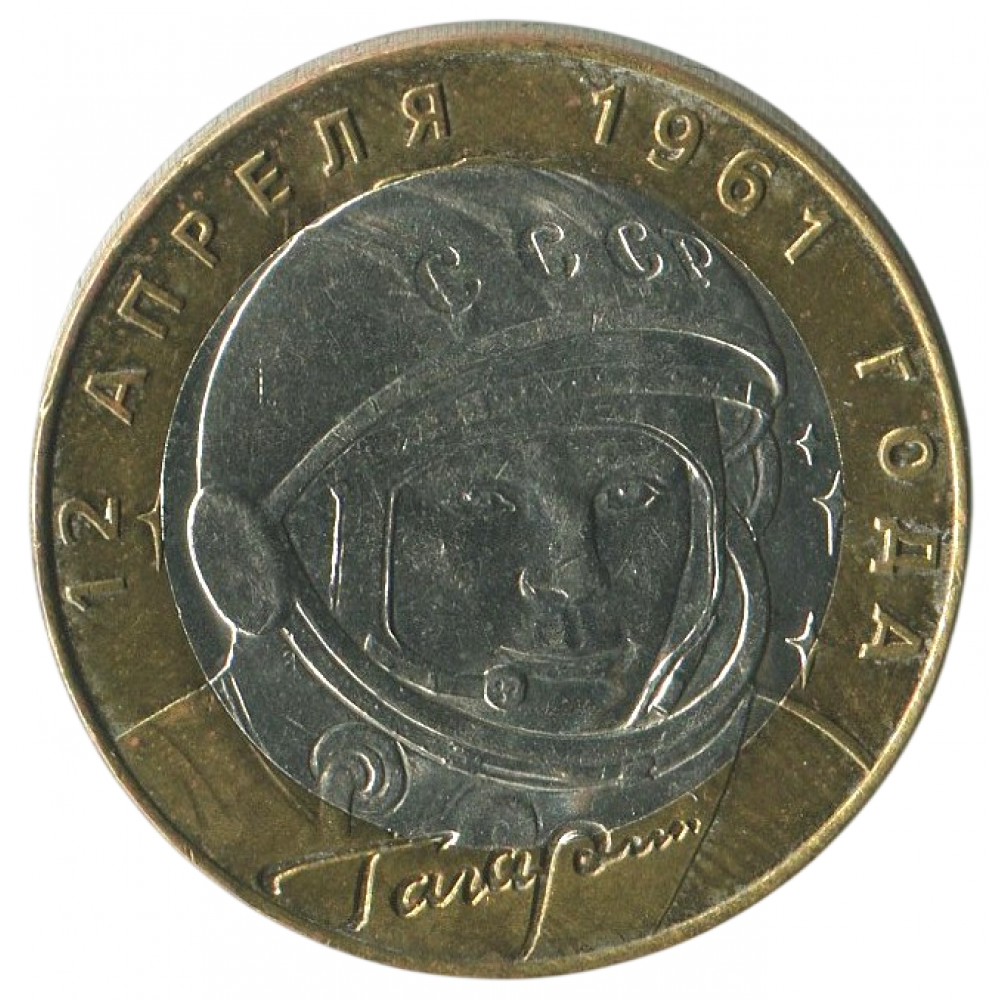 Реверс: изображение Ю.А. Гагарина в скафандре, под ним — подпись-факсимиле «ГАГАРИН», вверху по окружности — надпись: «12 АПРЕЛЯ 1961 ГОДА».