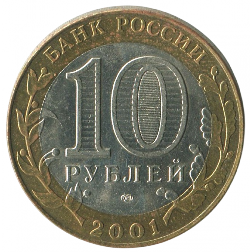 Аверс: сверху вдоль края монеты слова «БАНК РОССИИ», внизу год чеканки «2001», слева ветка оливы, справа дуба, обе ветки частично заходят на центральную вставку. В середине номинал «10» под ним слово «РУБЛЕЙ», внутри цифры «0» попеременно видимые при наклоне монеты надписи «10» и «РУБ». Над годом монограмма монетного двора «СПМД».