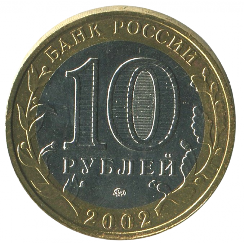 в центре диска - обозначение достоинства монеты "10 РУБЛЕЙ". Внутри цифры "0" - скрытые, видимые поочередно при изменении угла зрения изображения цифры "10" и надписи "РУБ". В нижней части диска - товарный знак монетного двора. В верхней части кольца по окружности - надпись: "БАНК РОССИИ", в нижней - дата "2002", слева и справа - стилизованные ветви растений, переходящие на диск.