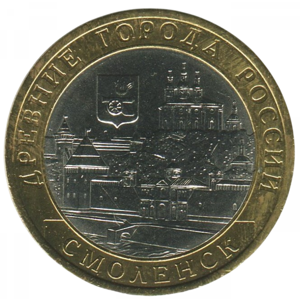 Реверс: в центре диска - Кремль, вверху слева - герб города Смоленска, справа - Успенский собор, по окружности на кольце - надписи: вверху - "ДРЕВНИЕ ГОРОДА РОССИИ", внизу - "СМОЛЕНСК".
