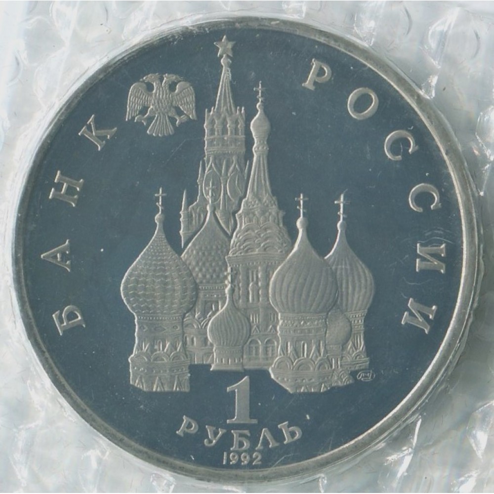 Аверс: сверху влево небольшое изображение двухглавого орла, слева слово «БАНК», справа «РОССИИ», внизу обозначение достоинства монеты - цифра «1» под ним слово «рубль», ниже год выпуска монеты «1992», в середине Собор Покрова Пресвятой Богородицы (собор Василия Блаженного) и за ним Спасская башня Московского Кремлля, чуть ниже и правее монограмма монетного двора «ЛМД».