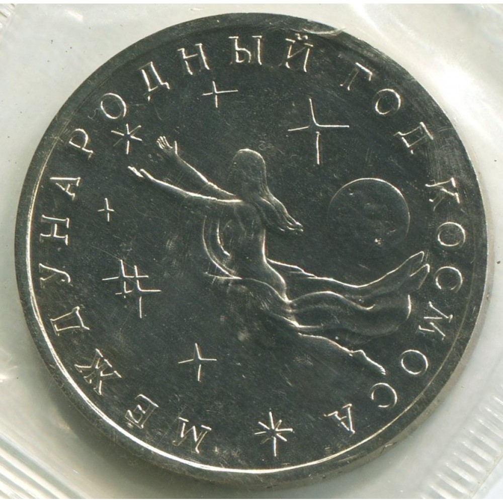 Реверс: символическое изображение созвездия Девы в виде летящей женщины на фоне звёздного неба, справа - изображение Земли, по окружности - надпись: "МЕЖДУНАРОДНЫЙ ГОД КОСМОСА", разделённая внизу звёздочкой.