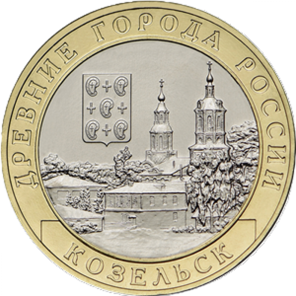 вид на Никольскую церковь, вверху слева — герб города Козельска; на кольце по окружности — надписи, вверху: «ДРЕВНИЕ ГОРОДА РОССИИ», внизу: «КОЗЕЛЬСК».