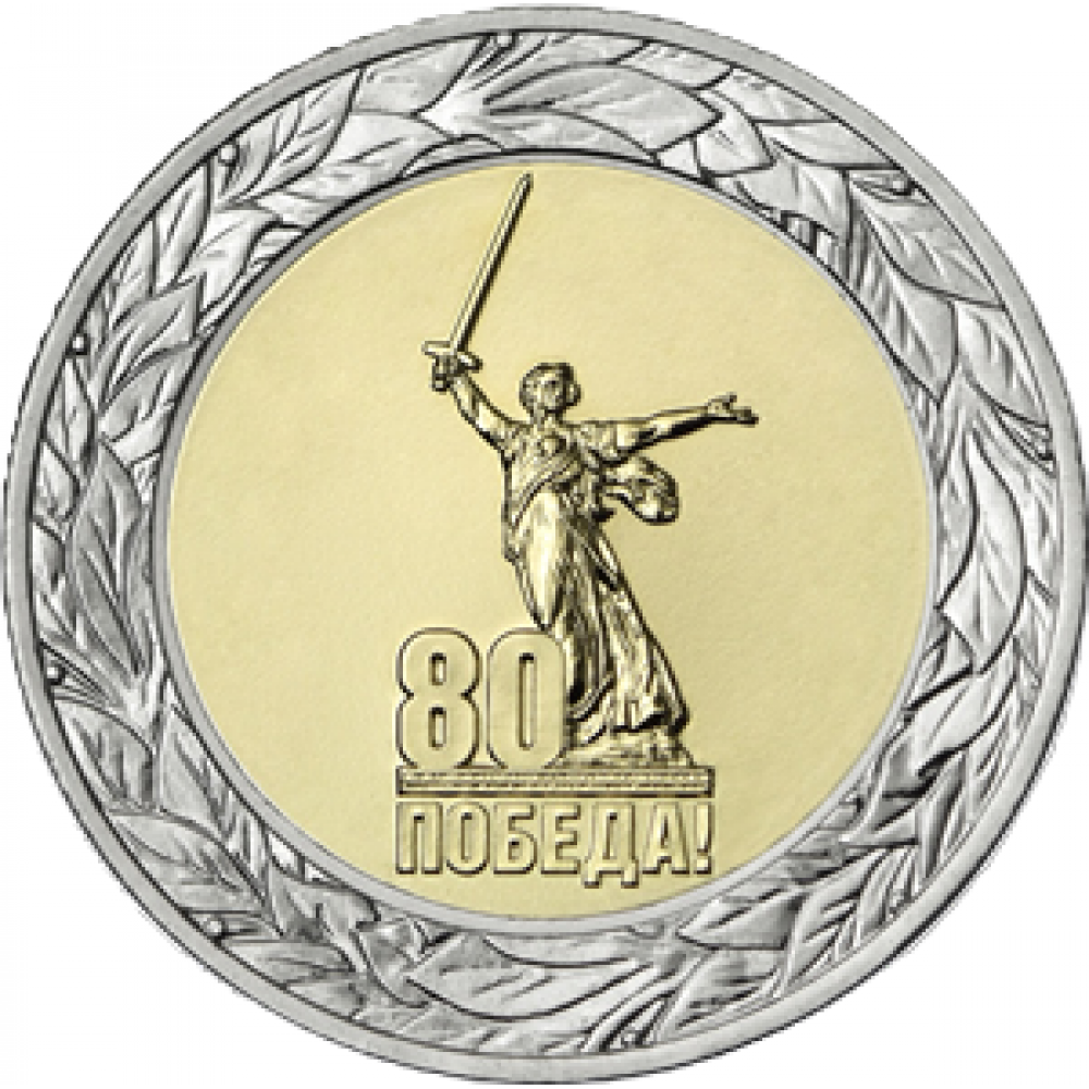 Реверс: рельефное изображение логотипа празднования 80-летия Победы в Великой Отечественной войне 1941–1945 годов; на кольце вдоль канта – рельефное изображение лаврового венка.